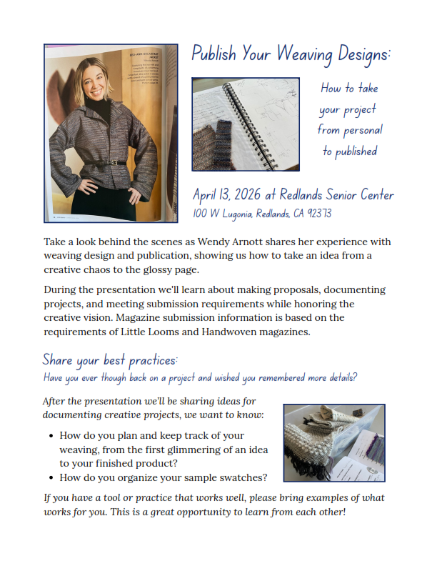 Sunday Weavers - Nov 3, 2024 - Sunday Weavers will be attending WeFF, a one-day weaving and fiber festival sponsored by Southern California Handweavers Guild (SCHG). The event is in Torrance, and there will be opportunities for carpool leaving from HOKC in Redlands at 8:30am and from Riverside (time TBD). WeFF is from 10am - 4pm at Torrance Cultural Arts Center. 3330 Civic Center Drive, Torrance, CA 90503.